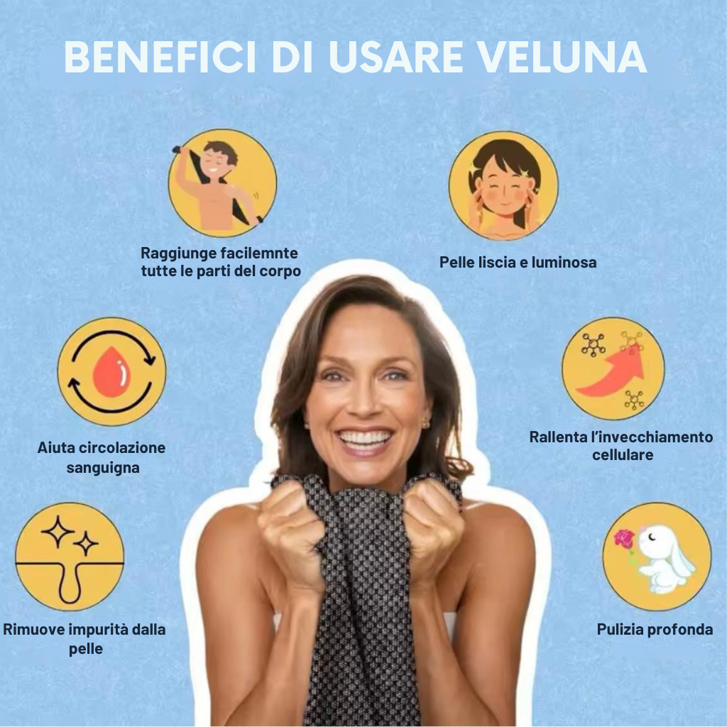 - Sì, Veluna è compatibile con la pelle sensibile. È necessario esercitare una leggera pressione durante lo scrub. Non deve essere utilizzato su pelle lesionata o ferita.